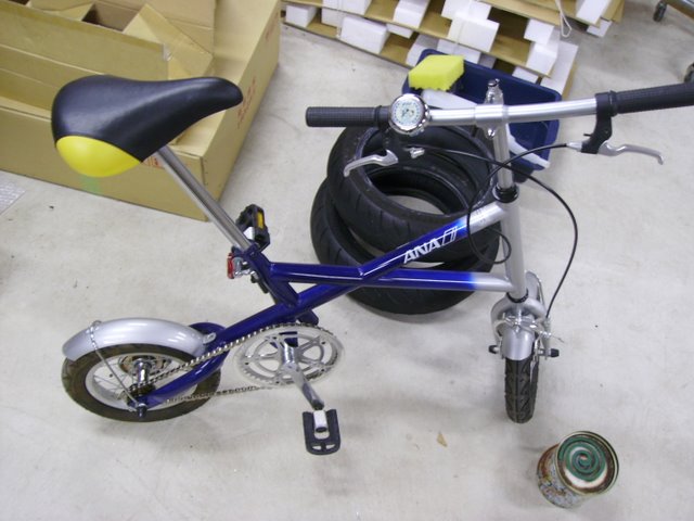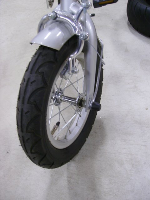 早速、A39の予定も考えずに取りに行きました。さすがに部屋においてあるだけあって、ものすごい綺麗です。タイヤも12インチな辺りやシートのツートンにおされさを感じます。「空気抜けてるから」と聞いていたので、3年程前にバイク、自転車共用の空気入れを入手していたのでそれを使い空気を入れ…って自転車の12インチって結構小さいのですね。