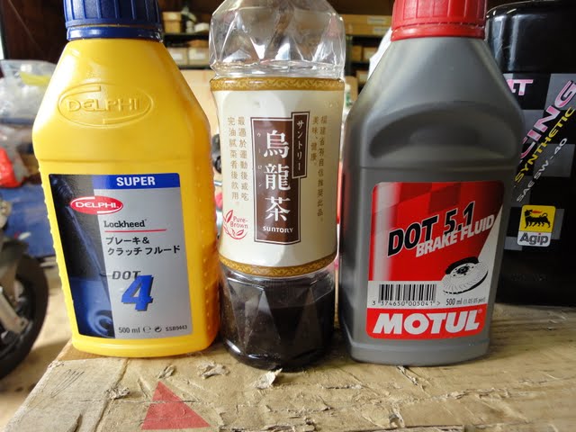 VXRのブレーキフルード交換しました。真ん中の烏龍茶容器に入っているのが抜いたフルードになります。