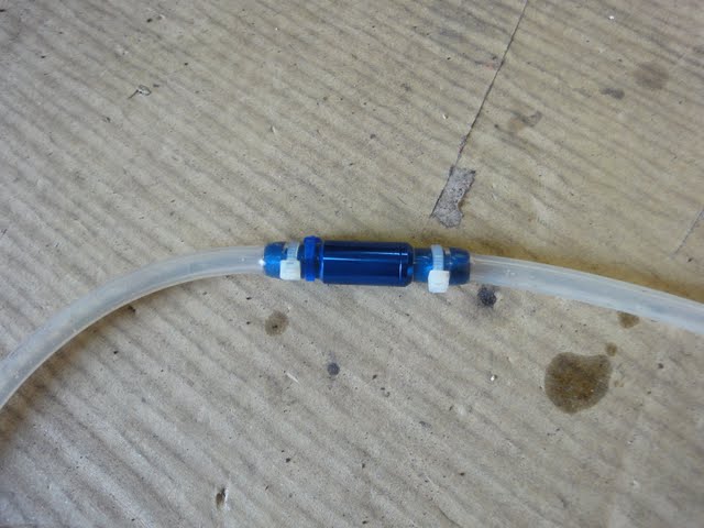 一人でブレーキ交換する場合に、あると便利なのが下の写真のワンウェイバルブと呼ばれる一方通行のバルブにシリコンホースつけた道具です。コレのおかげで「ブレーキ握って液出してブリーダのナット締めて」という面倒な手続きから開放されます。