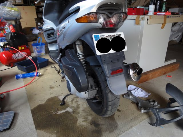 まぁいつものようにVXRのRSTという時点で何か起こるとは思っていたのですが、今回も微妙にサイズが合わない場所がありました。トップ写真の右下にあるRST用プレートとフェンダーがRSTフェンダーセットなるものなのですが、フェンダーをつけるためにRST用プレートが必要になります。このプレートはマフラー・右リアサス・リアホイール・RST用リアフェンダーをエンジン&フレームに固定するために利用します。この右リアサスの取り付け位置が微妙に上がっちゃいます。そのため、普通に右側だけ取り付けようとしてもリアサスの取り付け位置が合いません。怪力があればリアサスを伸ばして取り付け可能ですが、僕には無理でした。なので取り付けには左リアサスを外して先に右側をつけてから車体の重みでリアサス縮めて締め付ける必要があります。