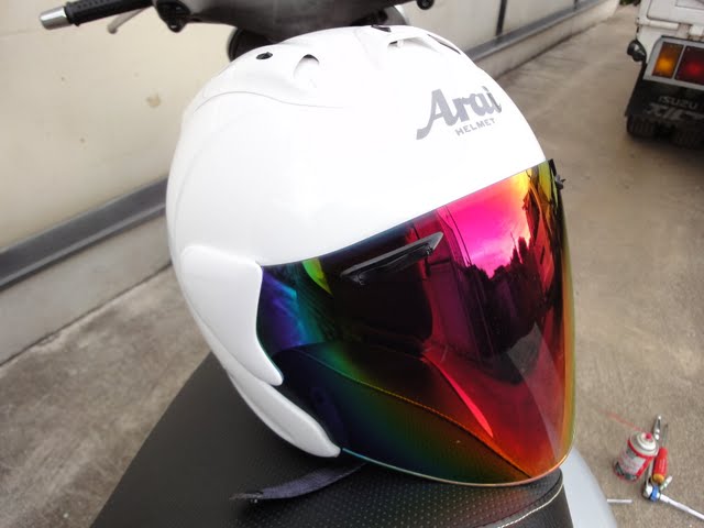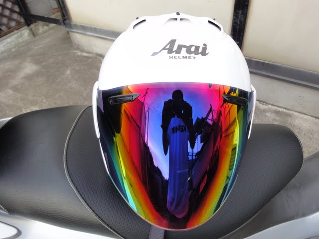 ついでに「おじさん、顔がブサイクだからスモークが良いんだよね」と言うと、「そうですね」と普通に受け入れられてしまったので悔しくてミラーシールドにしちゃいました(意味不明)。ブログ用の写真撮った後にVXRのいすに置いたまま、うろうろしていたらバイクにぶつかってメットが転げ落ちて、いきなり傷物になったのは内緒です。