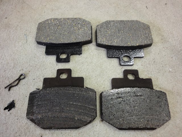 パッドを取り外して見ると見事なまでにアウト状態でした(汗。さて取り付けるかなとキャリパー見るとピストンが出ているために新品のパッドが入りません。古いパッドを再度入れて無理やりこじ開けようとするもうまくいかずiwaさんに電話で質問しちゃいました(汗。