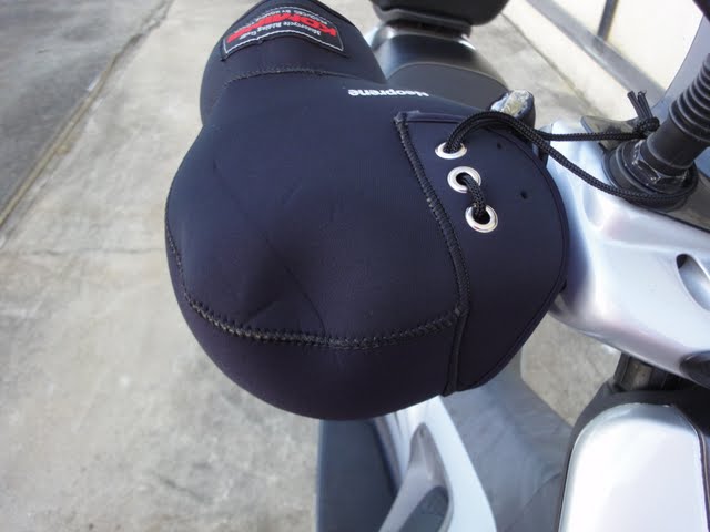 ハンドルウォーマーというとおばさんスクーターに取り付けてるイメージですが、そんな事は気にしていられないので暖かいなら…とチャレンジです。コミネのやつはネオプレーンとかいうウェットスーツのような素材でできている変わったハンドルウォーマーです。これなら春夏利用しているレーシンググローブとあわせて寒さ対策になるかな。