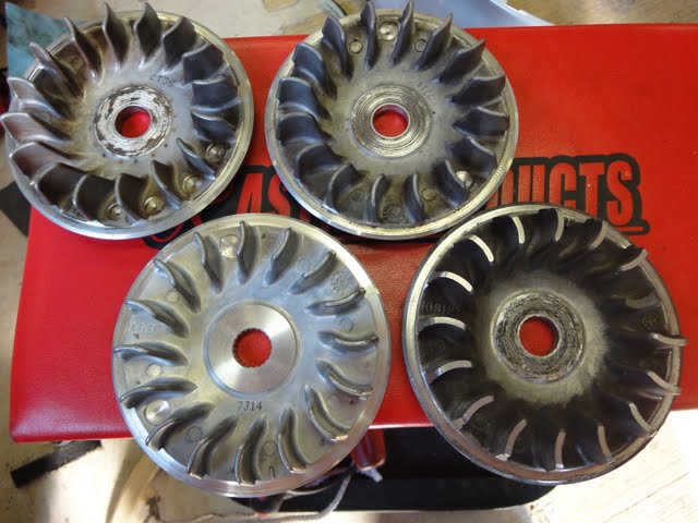 開けて見ると、案の定スプラインがなくなっています。これが今までお亡くなりになったハーフプーリー達…左下が社外の新品になります。何個買ってるんだ俺は…