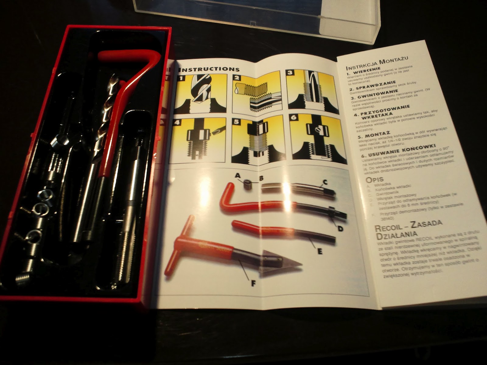 「最初から6.3mmのドリルで型とっておけば良いんじゃないの?」と思う人もいると思いますが、まさにその通りです。最初はM6タップでねじ山作るだけのつもりでしたが、途中で強度のこと考えてリコイル購入したので、失敗したなーと思いながら6.3mmで再度穴を広げました。今回は普通に真っ直ぐ入ったので良かったですが。で、説明書どおりにタップ切ってよくわからんバネ見たいのを専用ツールを使ってねじ込むとねじ山完成。ためしにスタッドボルトを取り付けるとぱっと見はいい感じになりました。