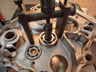 ベアリングは昔にAPで購入したベアリングプーラーを利用します。何気にさくっとばらしていますが、自宅部屋でのオイル駄々漏れ&パーツクリーナー臭による、各所からの苦情等々、かなり苦労しています。やっぱり自分の部屋では「組み立て」位が良いのかな(汗