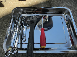 14㎜のスパナ(メガネは共締め解除に利用)とドライバー。長めのトルクかけれるスパナがなかったので最後の締めはモンキーで。