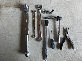今回利用した工具たち。左からトルクレンチ、12㎜、17㎜のコンビとソケット、8㎜のロングソケットとラチェット(ロングとショート)とO-リング外すやつとラジオペンチ(オイルまみれのものを取り出すのに使用)。