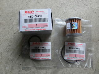 今回交換した純正パーツ類、上がオイルフィルターと箱、左下がオイルフィルターについてるO-リング。右下がエンジンオイルのボルトにつくO-リングです。