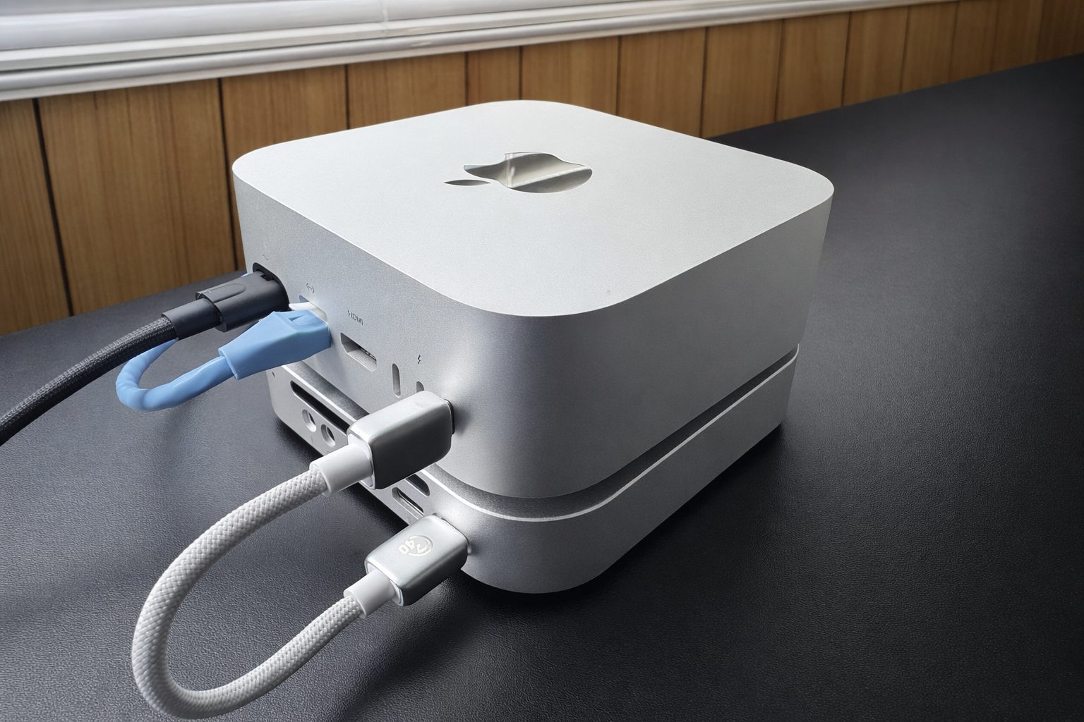 M45Pの底蓋がはめ込み式ではなく、磁力で付いている感じでしたが、基本触らないので問題なし。M45PをMac miniにつなぐときは、Mac mini背面のThunderbolt/USB4ポートを使います。